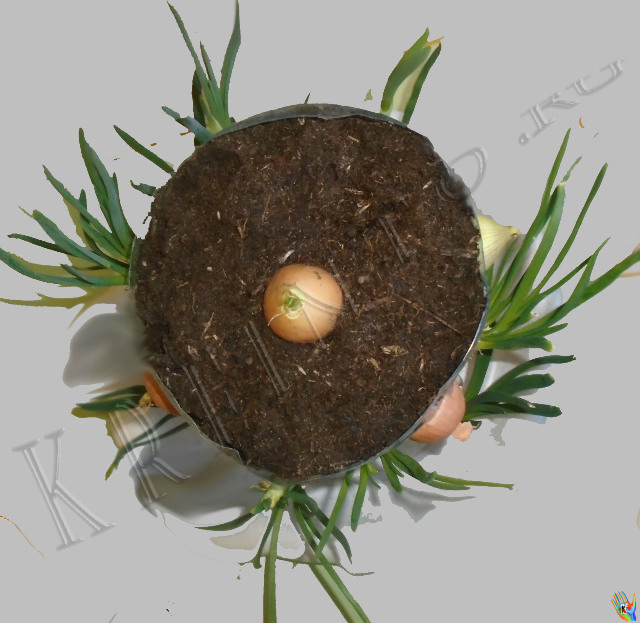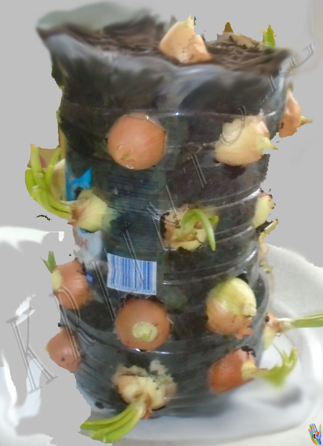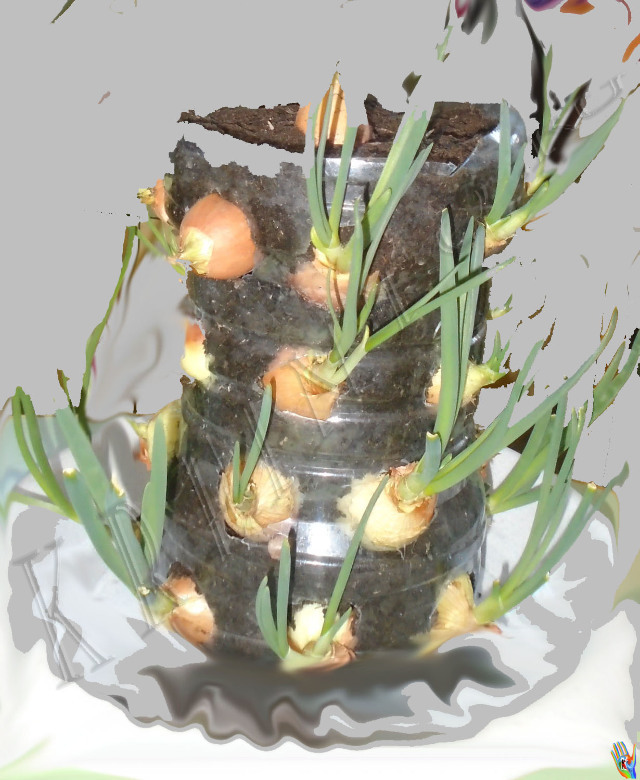 Сначала мы в обычной пластиковой бутылке обрезаем горлышко и делаем отверстия. Далее самое интересное засыпаем землю чередуя с луком,который сразу просовываем в отверстия и обязательно ставим на глубокий поддон, так как при поливе можно перелить воды,что как вы сами догадались,это приведет к уборке.. А теперь сам процесс в картинках